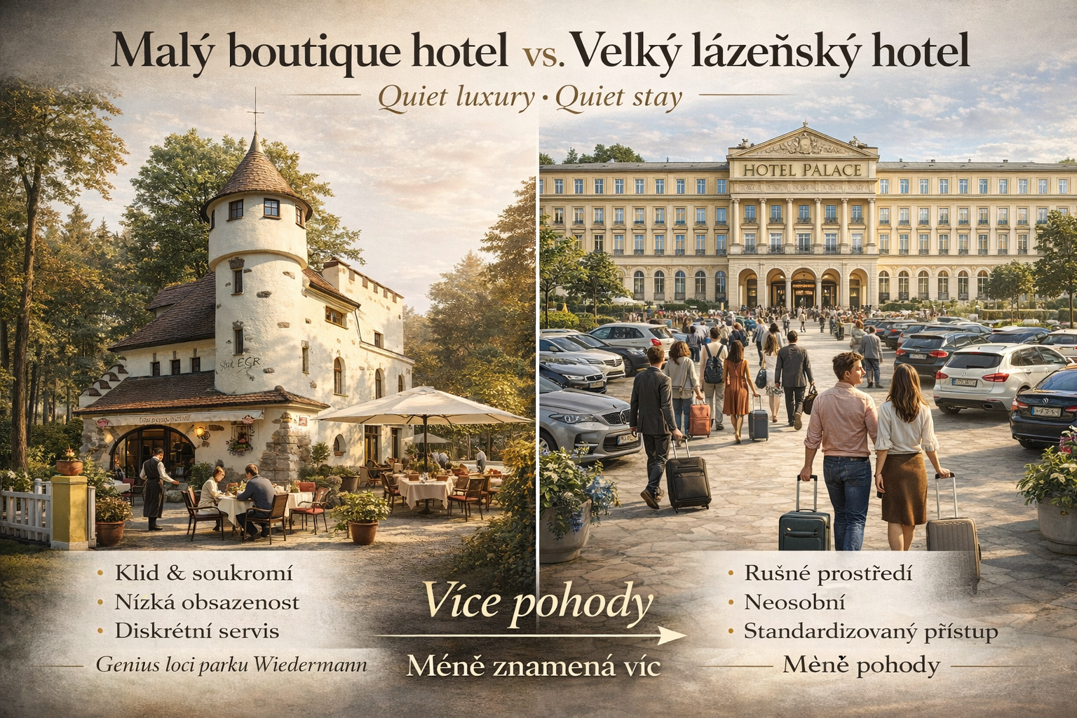 Malý hotel — nebo přesněji boutique objekt — funguje jinak. Ne proto, že by měl méně služeb, ale protože má jinou logiku provozu.