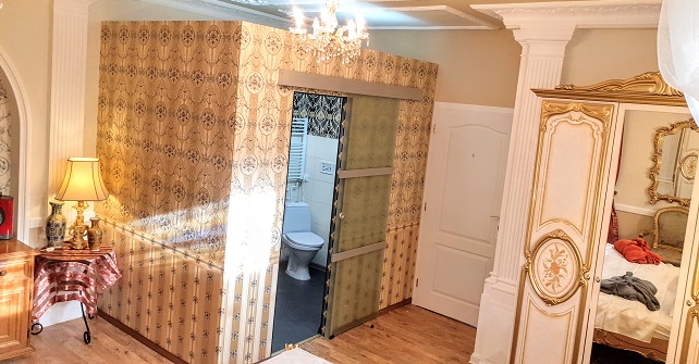 A gold bed with a rich KING SIZE carving, a large wardrobe, a table, a small sofa and an armchair are traditional features of this larger hotel room.